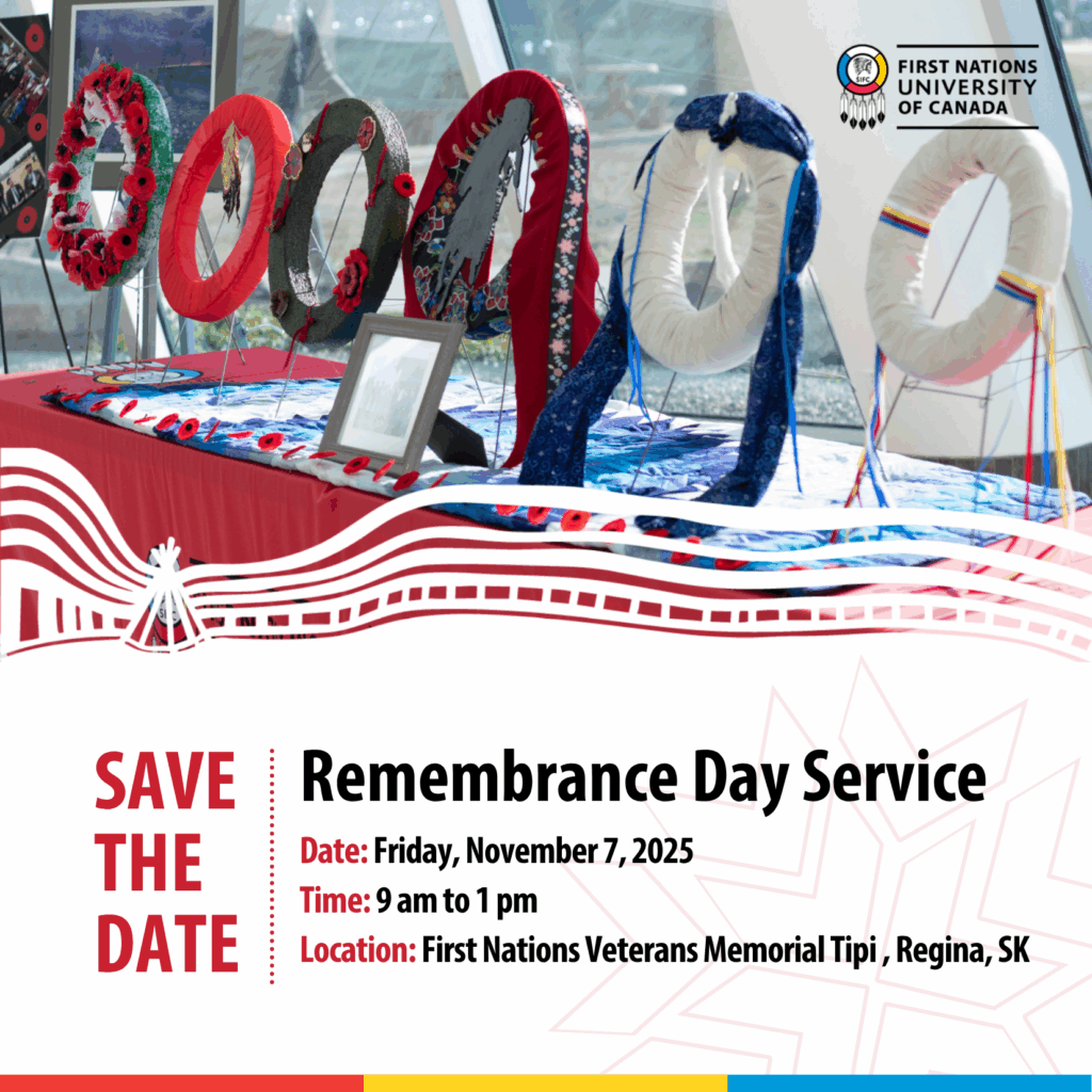 The First Nations University of Canada invites you to join us for our Remembrance Day Service as we come together to honour and remember our Veterans and all who have served. Pipe ceremony will begin at 9am. Parking will be available in Lot 12.
