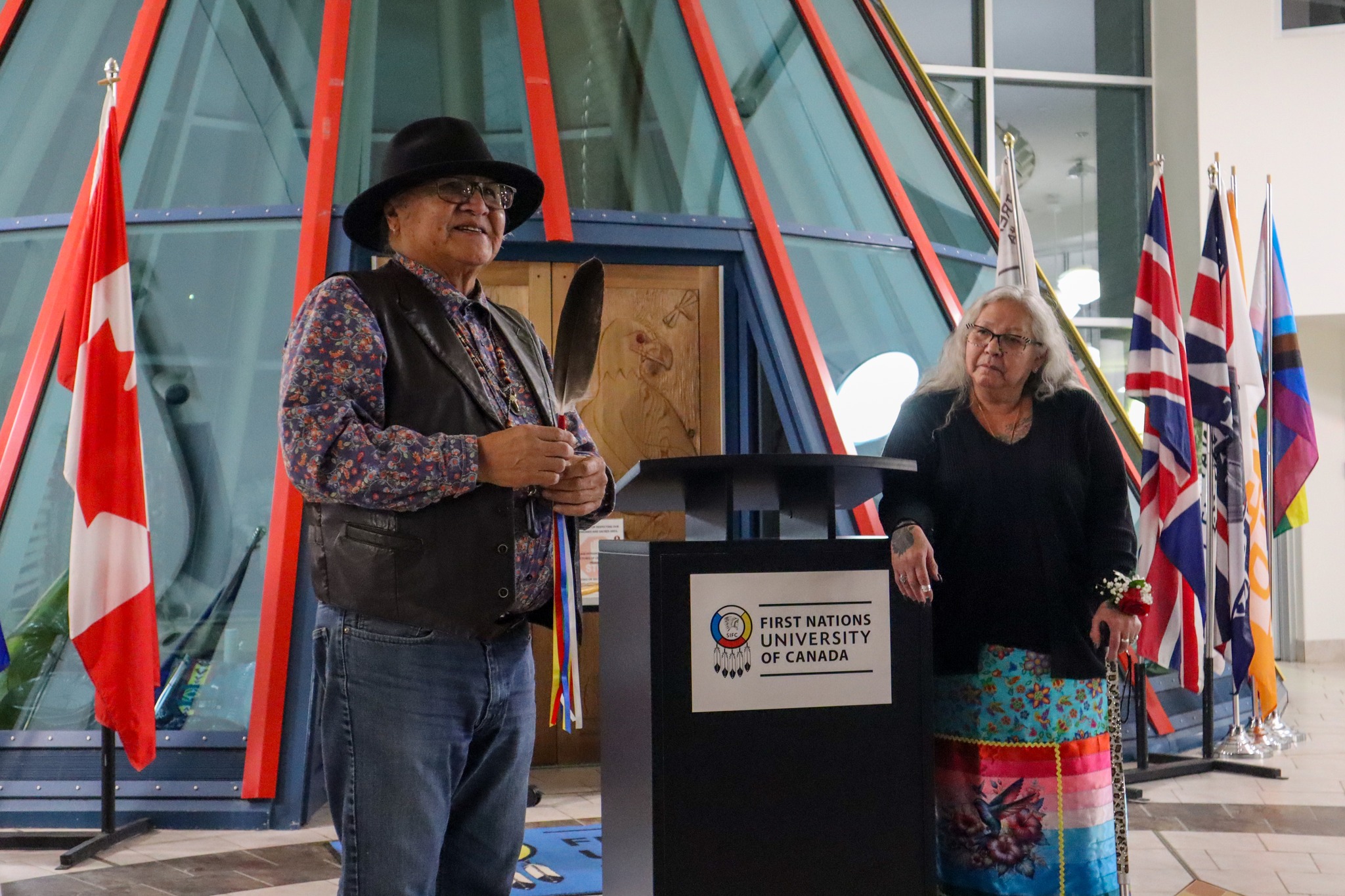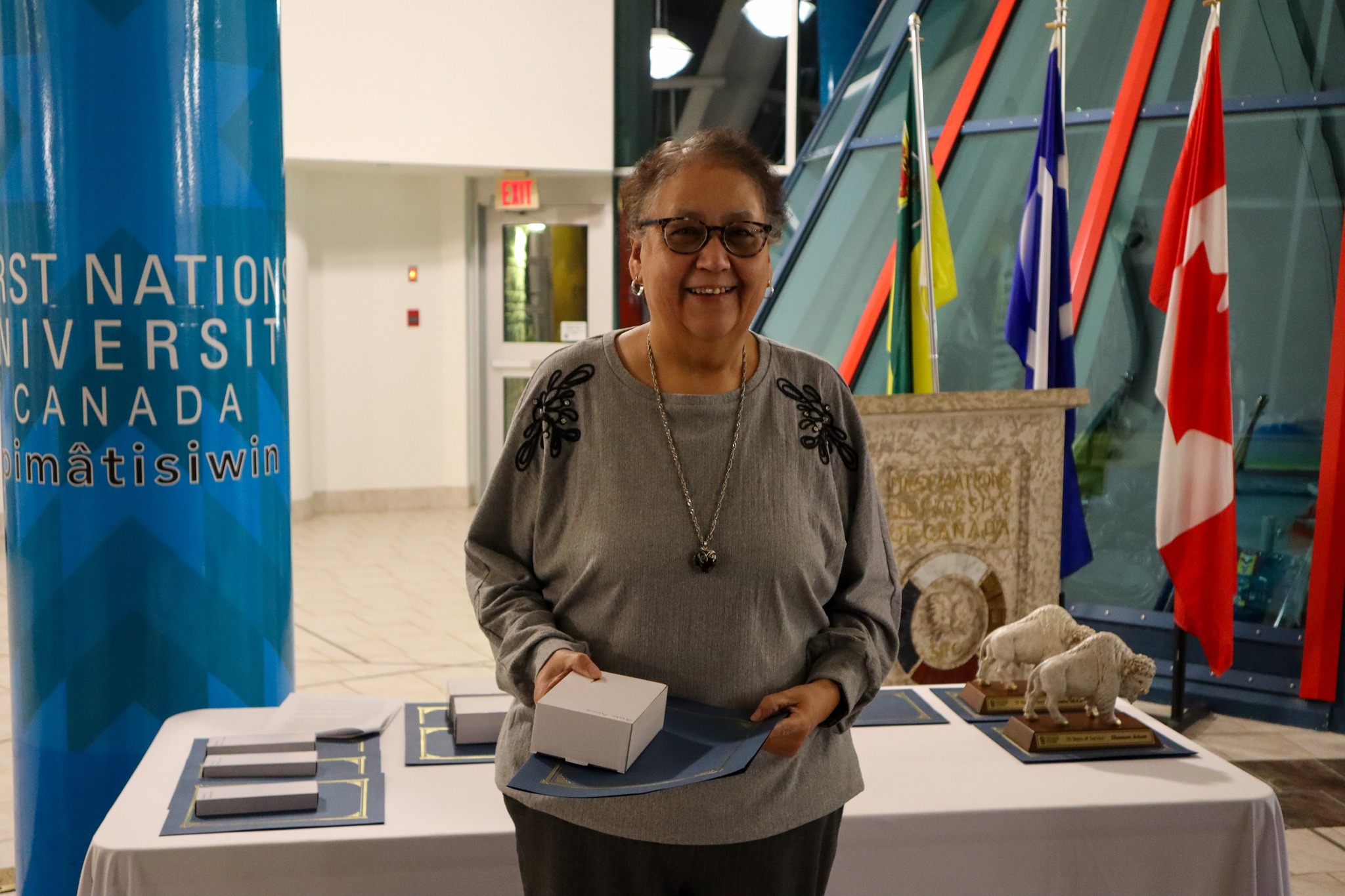 Knowledge Keeper Dennis Omeasoo enriched the evening by speaking about the significance of the eagle feather and offering a prayer as it was presented to Dr. Sharon Acoose, the 25-year recipient and Professor in Indigenous Social Work, who is based at the Saskatoon Campus. Additionally, Louise McCallum, who has devoted over 35 years to the Indigenous Social Work department at FNUniv, received a buffalo sculpture with an engraved plaque as a memorable gift of appreciation for her remarkable contributions.