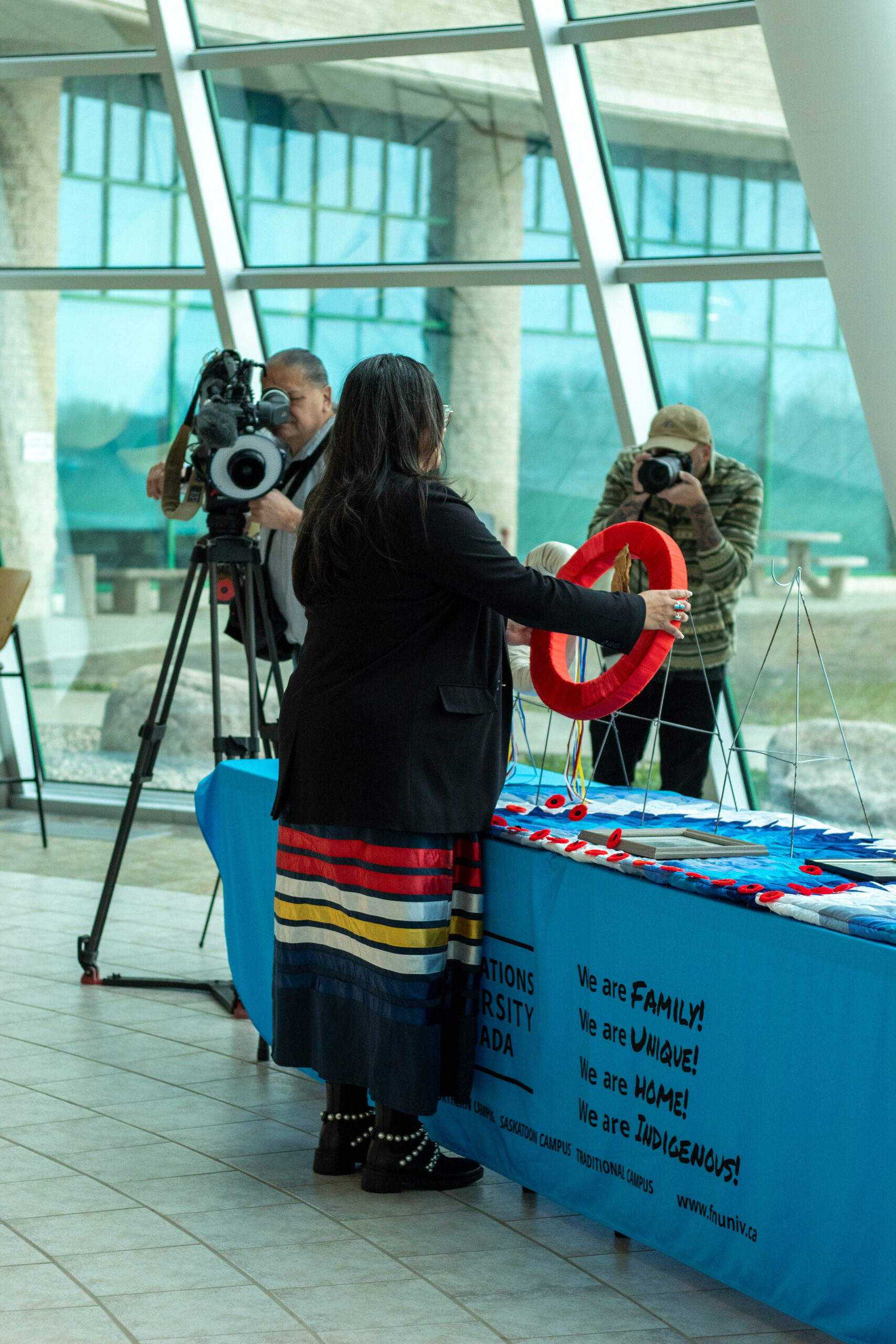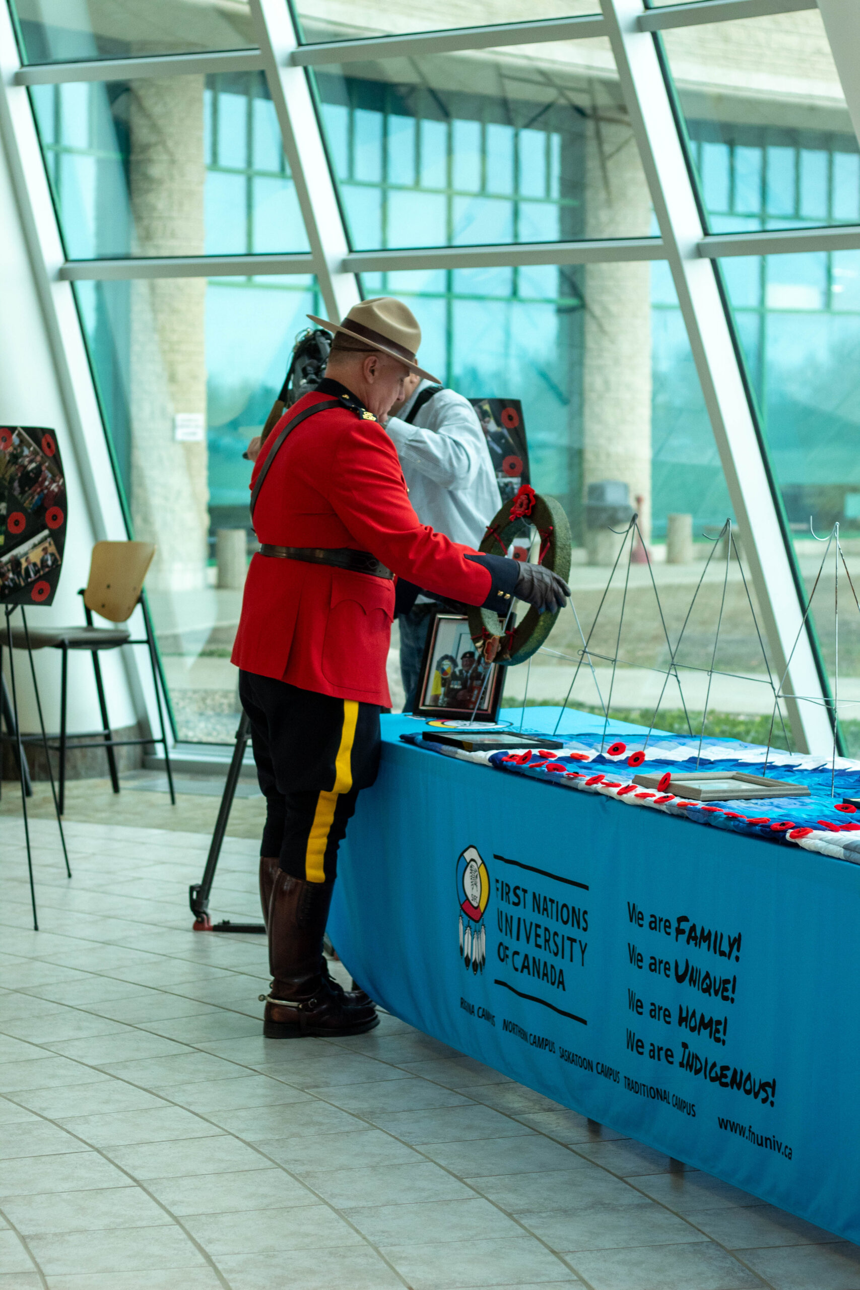 FNUniv extended an invitation to veterans and representatives from various organizations, including the Saskatchewan First Nations Veterans Association (SFNVA), the File Hills First Nations Police Service, the Royal Canadian Mounted Police (RCMP), the Regina Police Service, and the Royal Regina Regiment Infantry. We were also honoured by the presence of First Nations Chiefs and distinguished dignitaries.