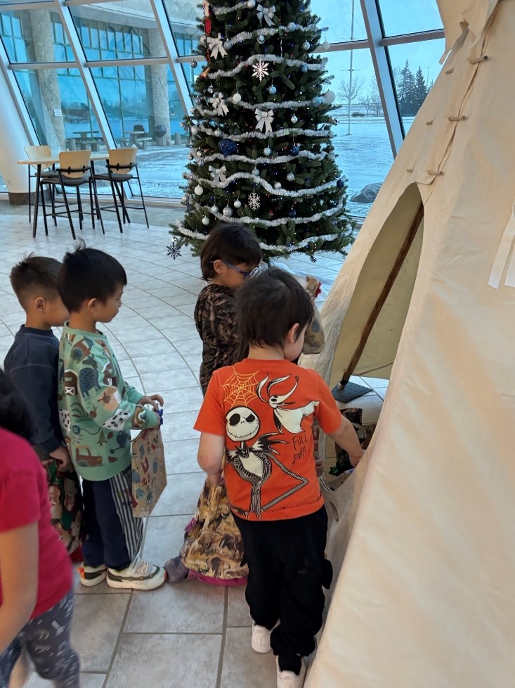This holiday season, about 20 preschoolers from pamināwasowin Child Care Centre filled the Atrium with joy, carrying gifts to the tipi beside the Christmas tree for the Elder’s Office Annual Elders Christmas Dinner.