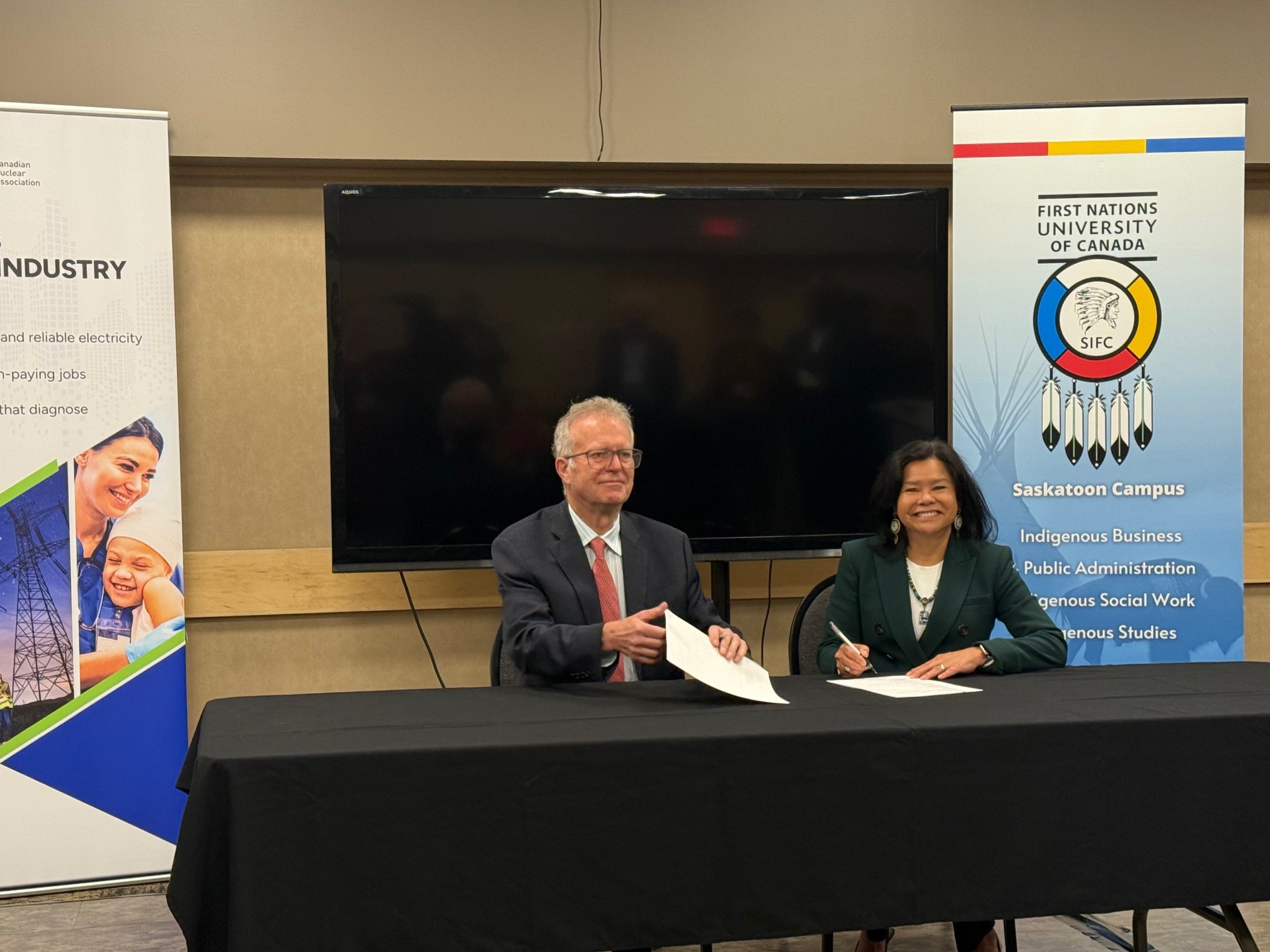 SASKATOON, SK — The First Nations University of Canada (FNUniv) and the University Network of Excellence in Nuclear Engineering (UNENE) have signed a Memorandum of Understanding (MOU) marking a new chapter in advancing nuclear and engineering sciences through the weaving together of Indigenous and Western ways of being, knowing, and doing. The agreement strengthens Indigenous leadership, participation, and capacity in Canada’s clean-energy and nuclear sectors.